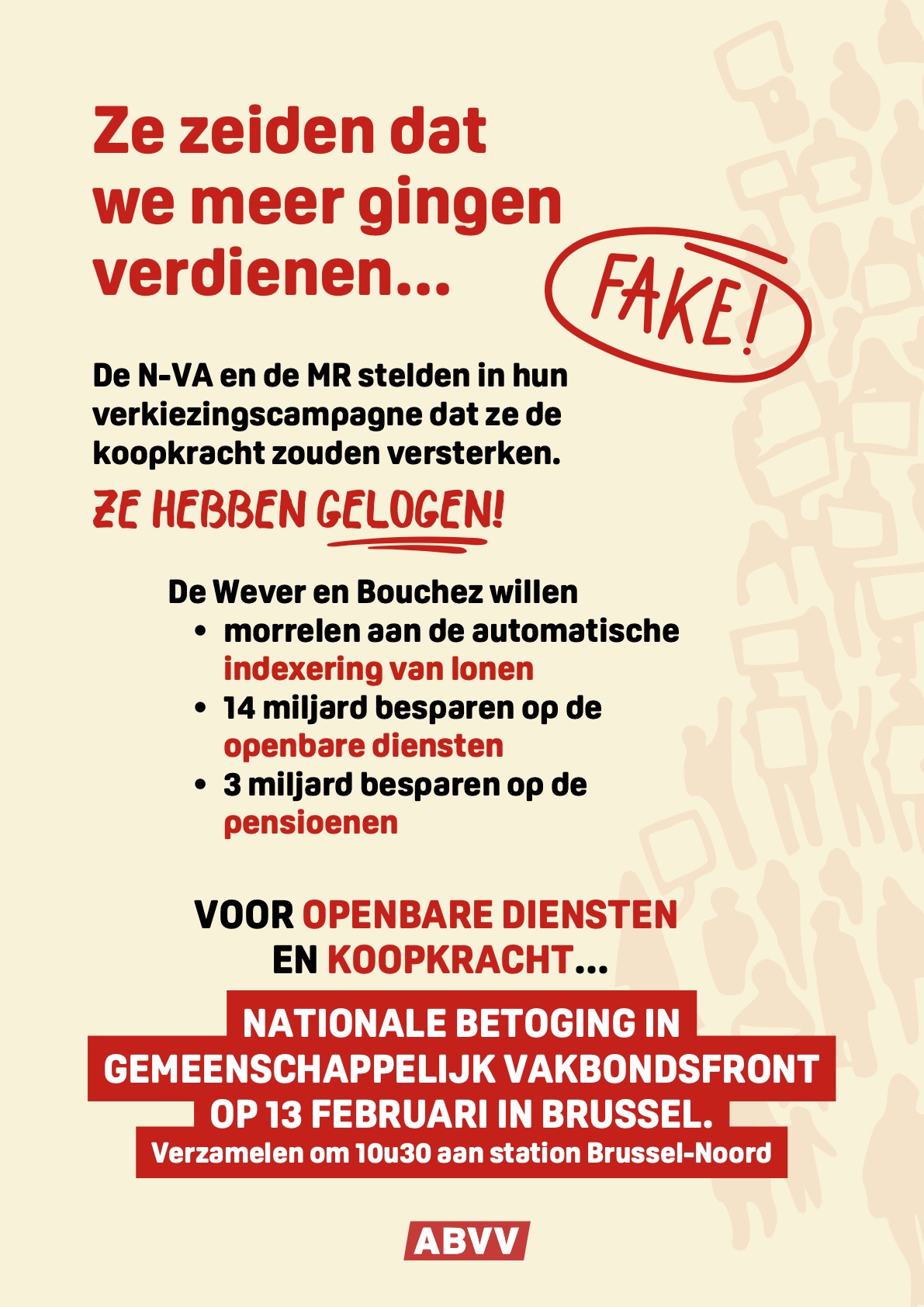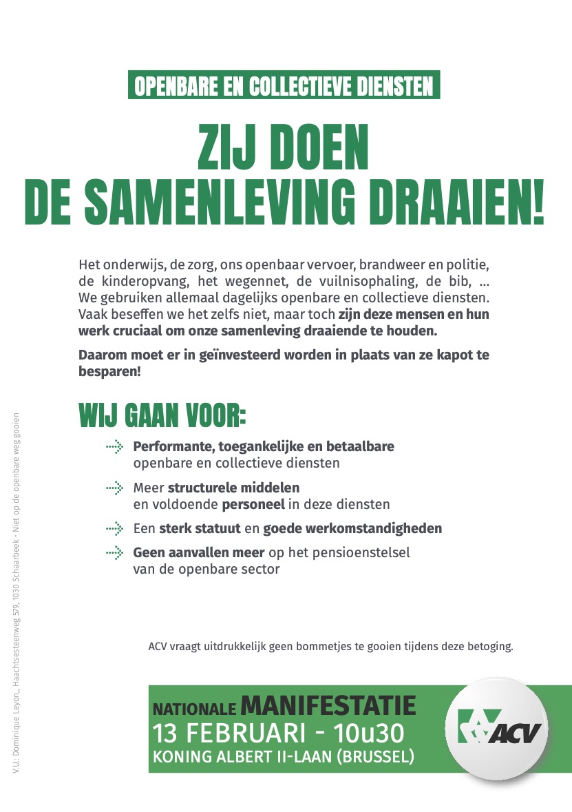 Het gemeenschappelijk vakbondsfront organiseert op donderdag 13 februari 2025 een nationale betoging om de rechten van de werknemers in de openbare diensten te verdedigen. Om 10.30u start de betoging op de Koning Albert II-Laan. Deze betoging is de derde actiedag in het kader van het Arizona-actieplan van het ACV. Elke 13de van de maand wordt een symbolische actie voorzien.